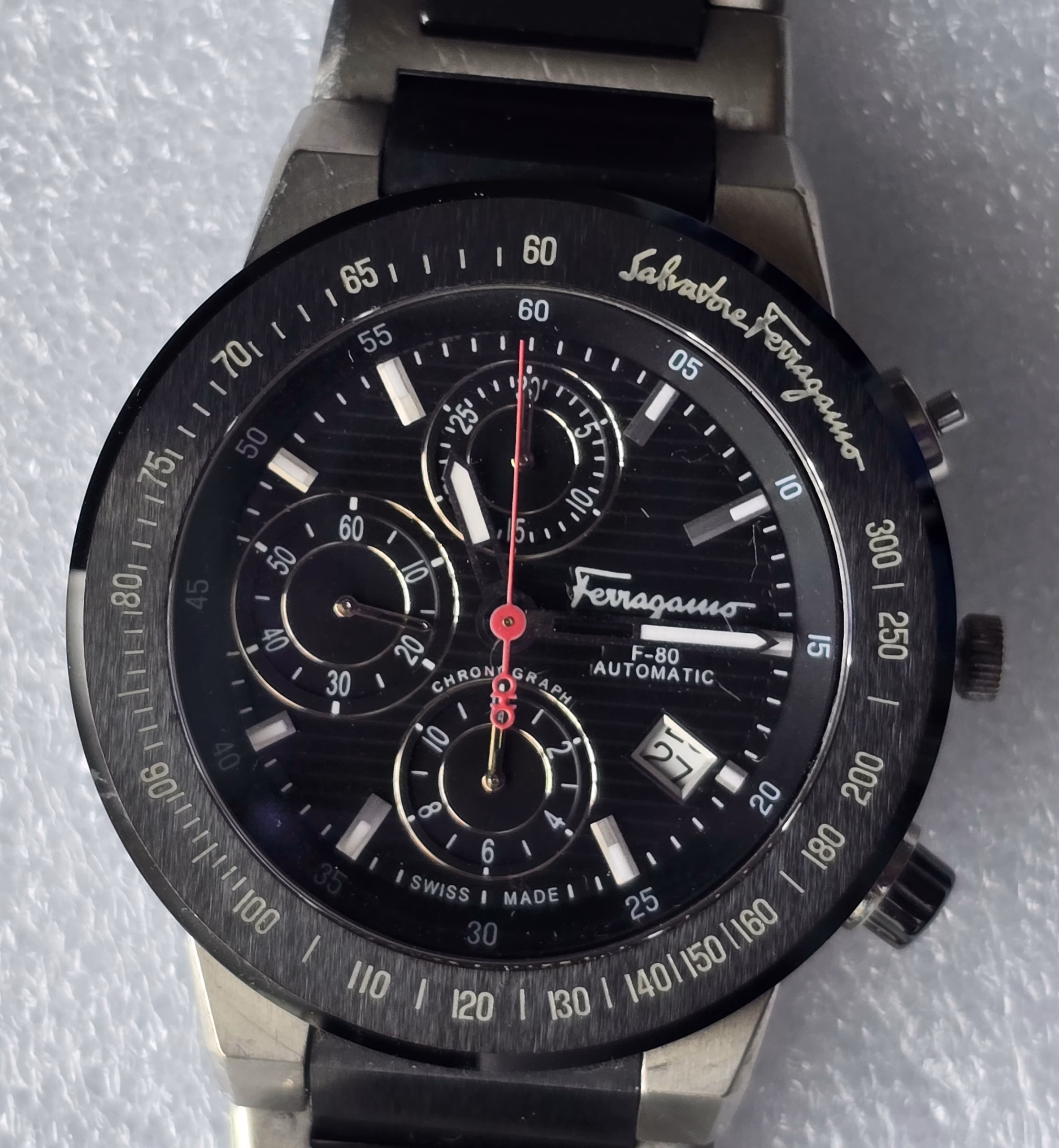 SALVATORE FERRAGAMO F-80 Steel Chrono. Ref: K08050927. Cal: 7750. For Service
